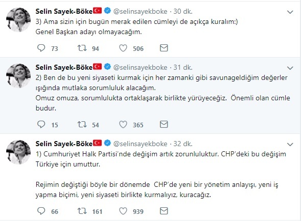 "Cumhuriyet Halk Partisi’nde değişim artık zorunluluktur. CHP’deki bu değişim Türkiye için umuttur. Rejimin değiştiği böyle bir dönemde CHP’de yeni bir yönetim anlayışı, yeni iş yapma biçimi, yeni siyaseti birlikte kurmalıyız, kuracağız. Ben de bu yeni siyaseti kurmak için her zamanki gibi savunageldiğim değerler ışığında mutlaka sorumluluk alacağım. Omuz omuza, sorumlulukta ortaklaşarak birlikte yürüyeceğiz. Önemli olan cümle budur. Ama sizin için bugün merak edilen cümleyi de açıkça kuralım:) Genel Başkan adayı olmayacağım."