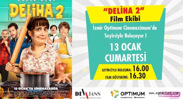 Deliha 2'nin BKM Ege Bölge Temsilciliği Devajans Organizasyonuyla gerçekleştirilecek İzmir Galası İzmir Optimum'da yapılacak. Galaya başrol oyuncuları ve yönetmen de katılacak. Saat 16:00'da seyirciyle buluşacak olan Deliha 2 ekibi, 16:30'da da filmi Cinemaximum salonlarında İzmirliler'le birlikte izleyecek.