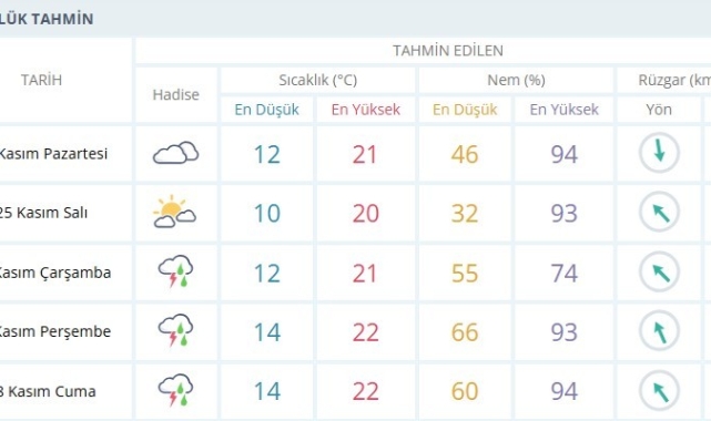 Kentte soğuk hava ve yağış bekleniyor.İzmir’de haftanın ilk mesai günü çok bulutlu ve 21 derece olacak.Salı günü ise parçalı bulutlu 20 derece olacak.Çarşamba günü itibariyle kente yağmur bulutları giriş yapacak.Haftanın son üç gününde yağışlı hava bekleniyor.
