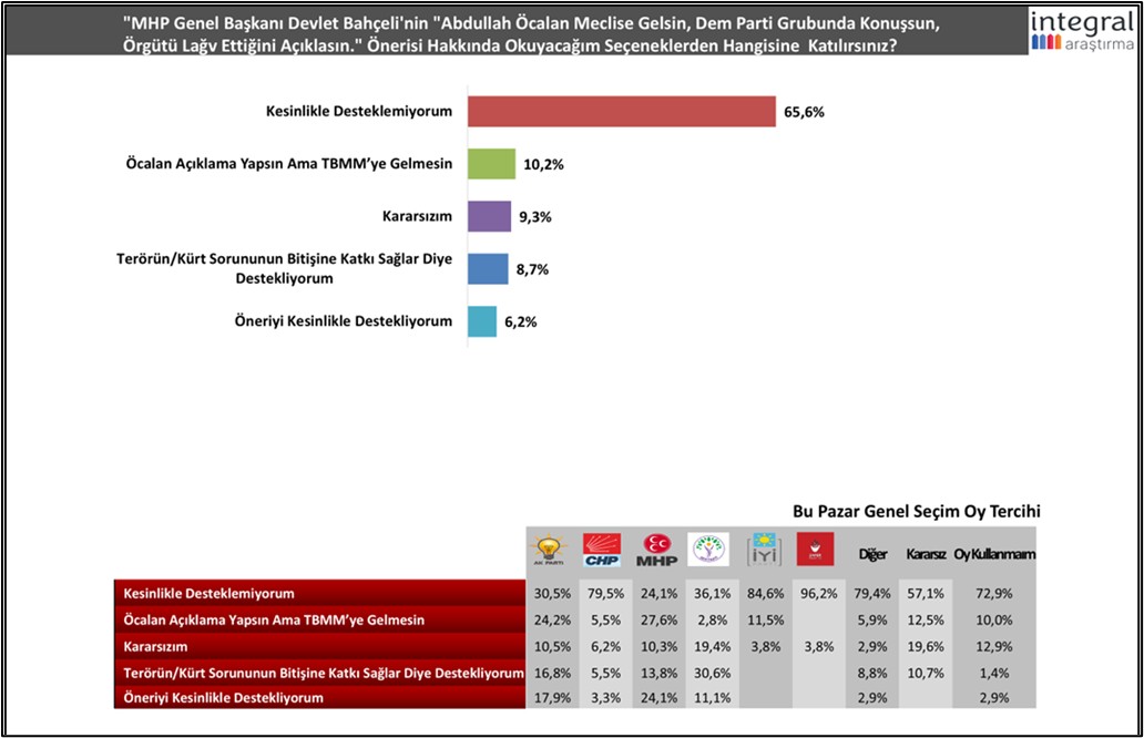 Katılımcıların; yüzde 65,6’sı “Kesinlikle desteklemiyorum” yanıtını verirken; Öcalan’ın terör örgütüne çağrı yapmasını ancak Meclise gelmesini istemeyenlerin oranı yüzde 10,2 olarak karşımıza çıktı.
