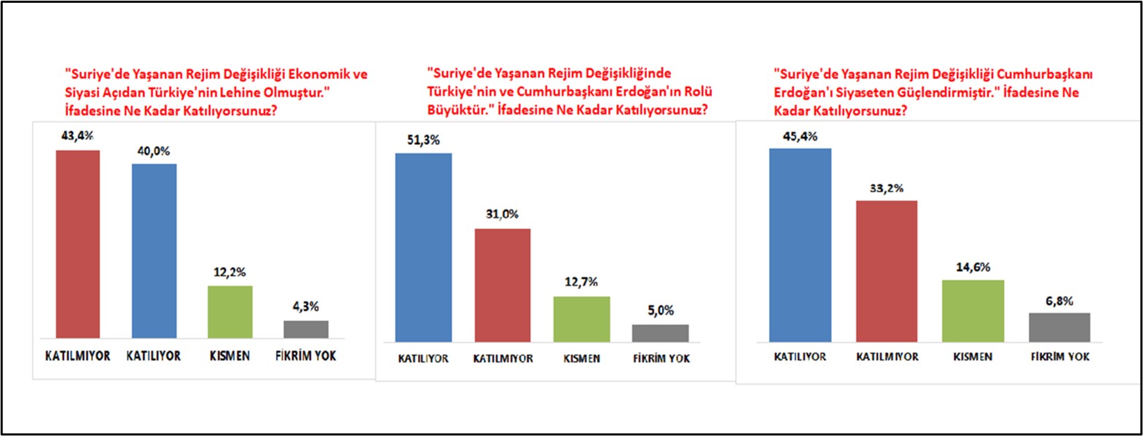 Son dönemde, en önemli gündem maddelerinden biri olan “Suriye’deki rejim değişikliği” başlığı da araştırmanın öne çıkan konularından biri oldu. İki İzmirliden biri, bu değişikliğin Türkiye’nin ekonomik ve siyasi açıdan lehine olduğuna kısmen de dahil olmak üzere katıldığını belirtirken; bu sürece Cumhurbaşkanı Recep Tayyip Erdoğan’ın rolünün büyük olduğuna inananlar yüzde 75’e; Erdoğan’ın siyaseten güçlendiğini düşünenler ise yüzde 70’e yakın tespit edildi.