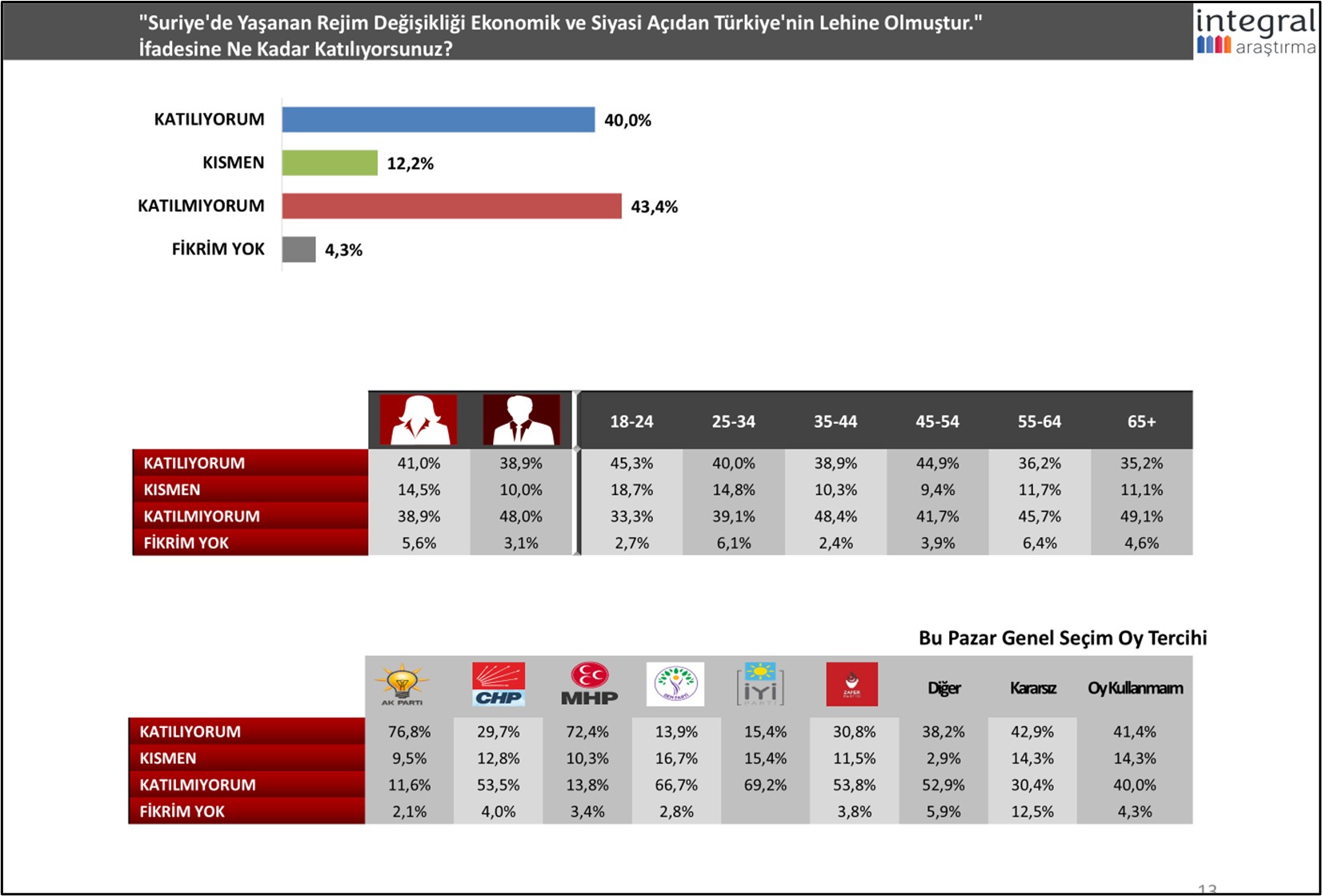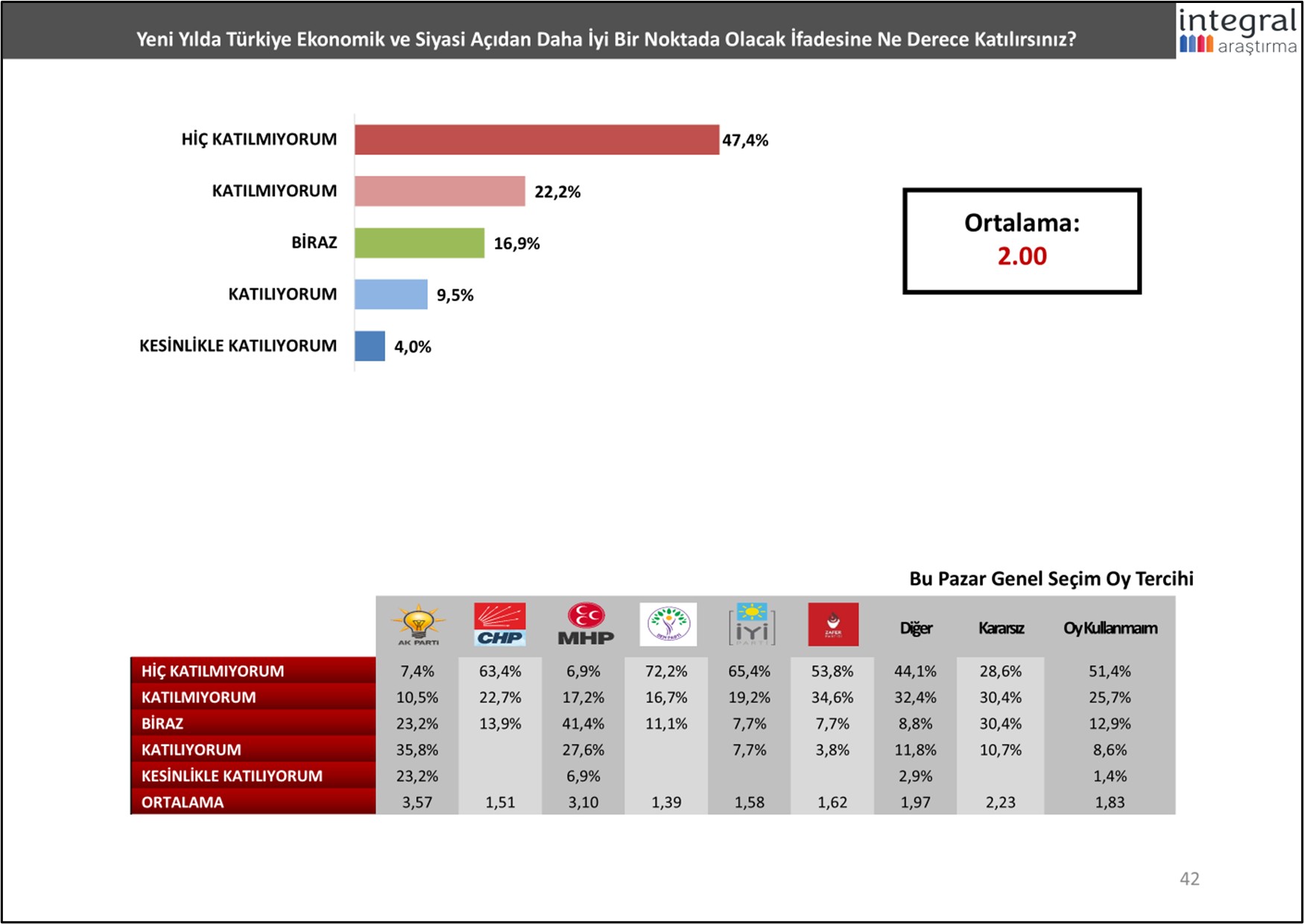 Suriye’de yaşanan gelişmelere ilişkin verilen “Türkiye ve Erdoğan karnesinde” ise; Erdoğan’ın rolü ve güçlenmesi, ülkenin ekonomik ve siyasi kazanımlarının önüne çıkıyor. Güncel daha pek çok başlığı sorgulayan İntegral’in; İzmirlilerin 2025 yılında ülkenin ekonomik ve siyasal açıdan daha iyi olup olmayacağına ilişkin sorusunun karşılığı ise, “umutsuzluk” olarak ortaya çıktı.