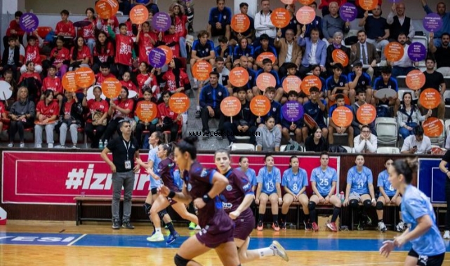 İzmir Büyükşehir Belediyesi Spor Kulübü Kadın Hentbol Takımı’nın Trabzon Ortahisar ile karşılaştığı müsabakada Türkiye’nin kanayan yarası kadına şiddete ve kadın cinayetlerine dikkat çekildi.