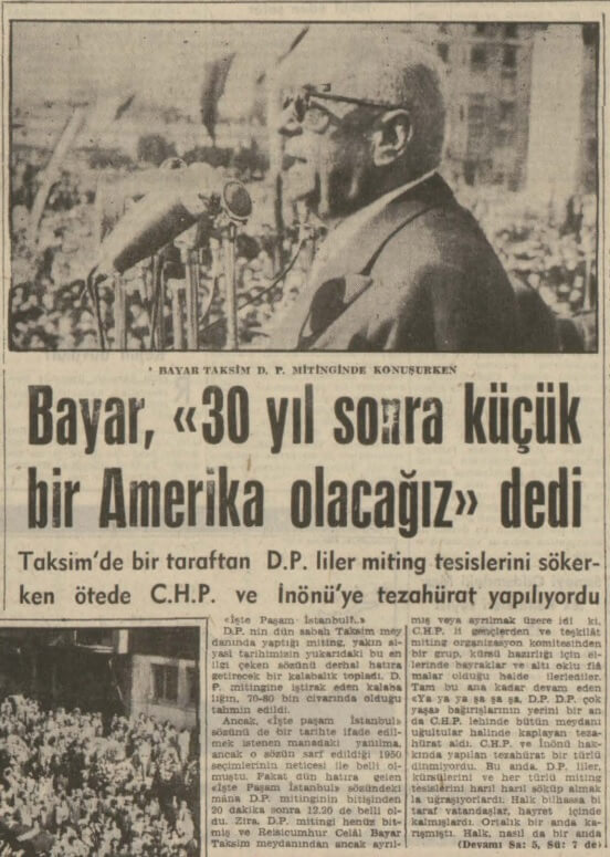 İstiklal Savaşı’nın “Galip Hocası” Celal Bayar’ın Cumhurbaşkanı, Atatürk’ün toprak reformu isteğine karşı çıkan toprak ağası ve Amerikan Koleji mezunu Adnan Menderes’in Başbakan olduğu 14 Mayıs 1950 seçimleri, aynı zamanda çok partili fiili yaşama geçişi de Türkiye’ye getirdi. Çok ilginçtir, Atatürk’ün kadrosunda bulunan, İş Bankası’nı kuran, İstiklal Savaşı’nda “bağımsızlık” uğruna faaliyet gösteren Celal Bayar, Demokrat Parti’yle birlikte meydanlarda “küçük Amerika olacağız” diye bağırmıştır.
